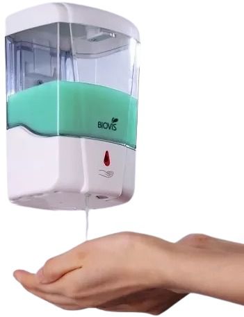 Dispenser plástico de parede para sabonete líquido ou álcool em gel, acionado por sensor de presença.